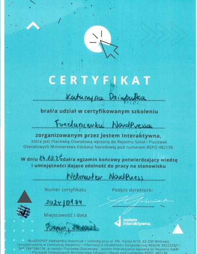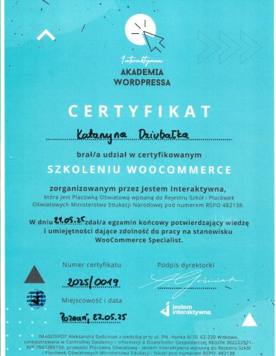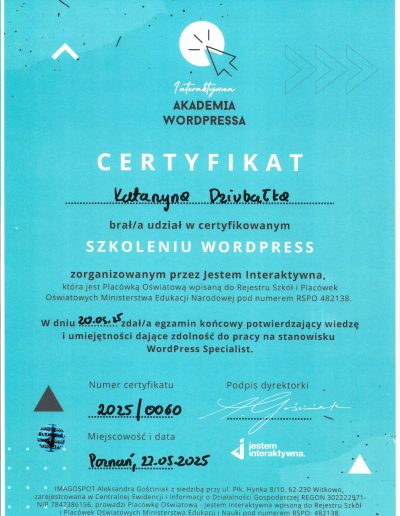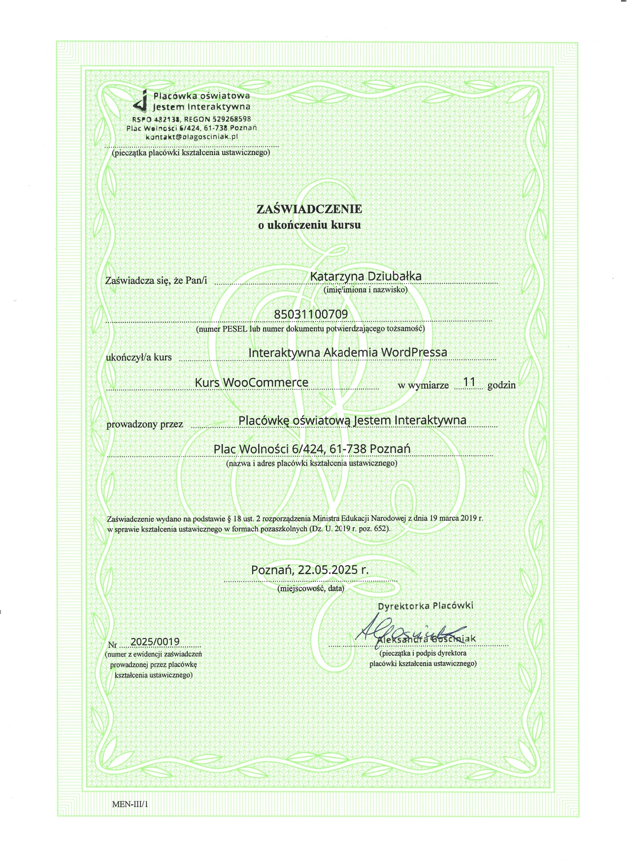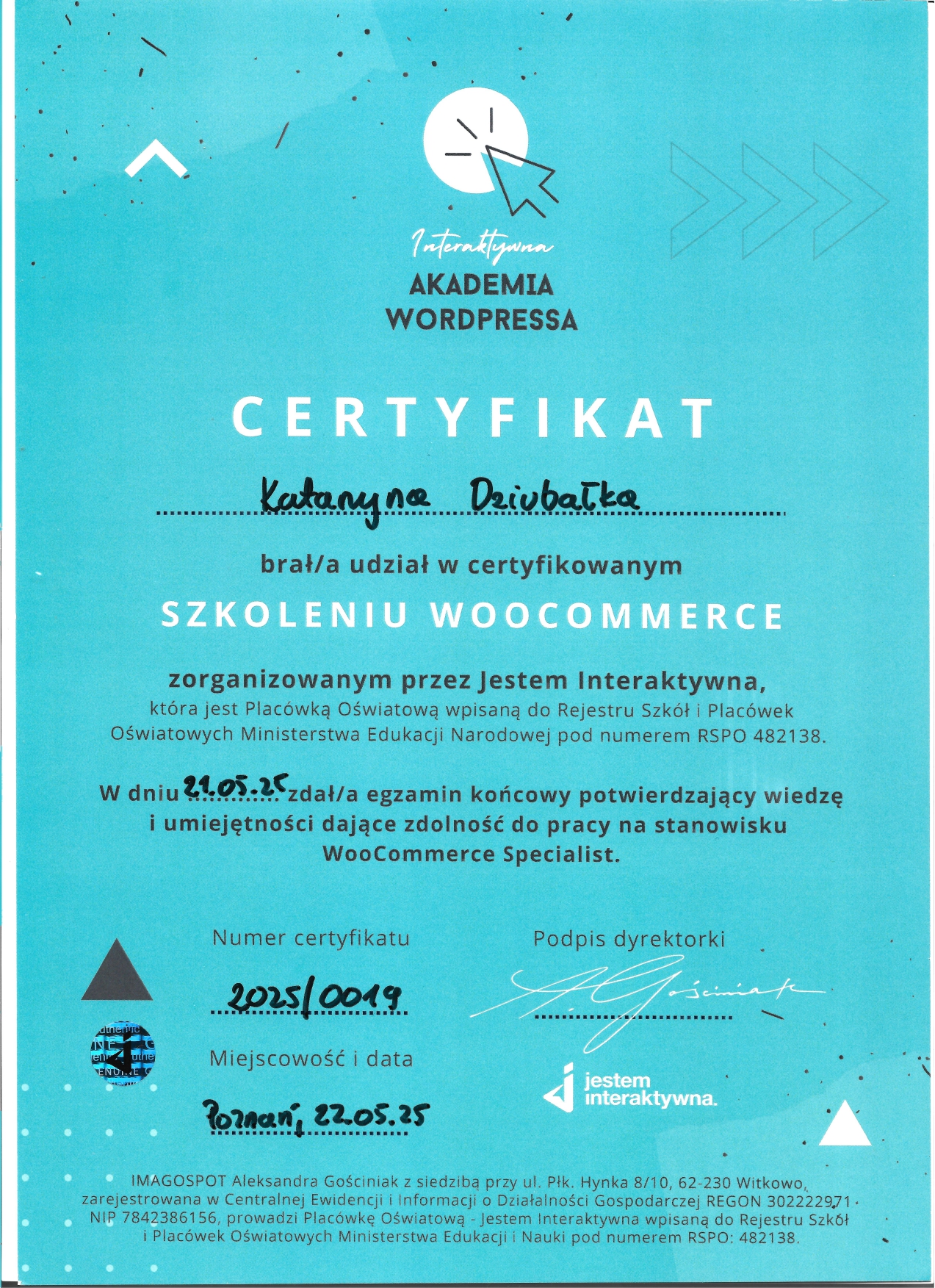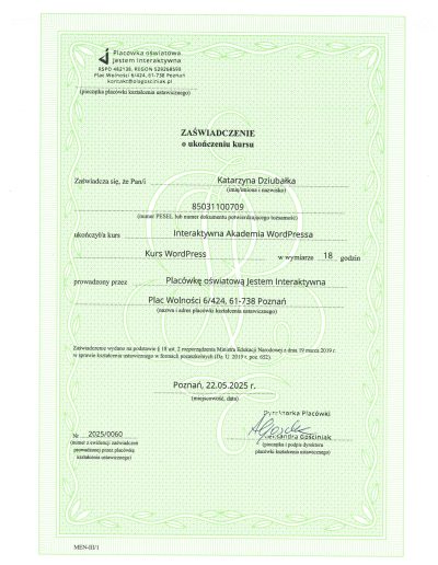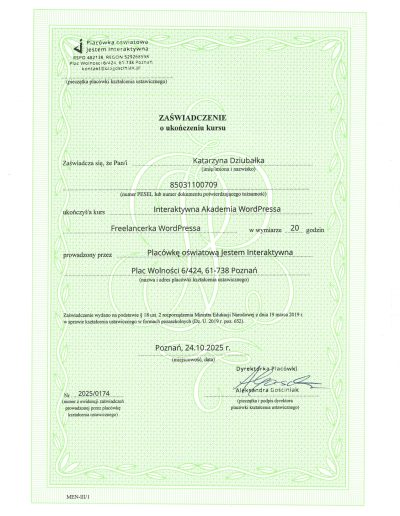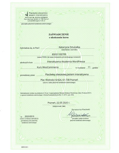 Dlatego poszłam krok dalej. Ukończyłam Interaktywną Akademię WordPress i WooCommerce (potwierdzoną egzaminem MEN) oraz rozpoczęłam naukę w MailerLite Academy, aby łączyć pasję do technologii z budowaniem autentycznego wizerunku online.