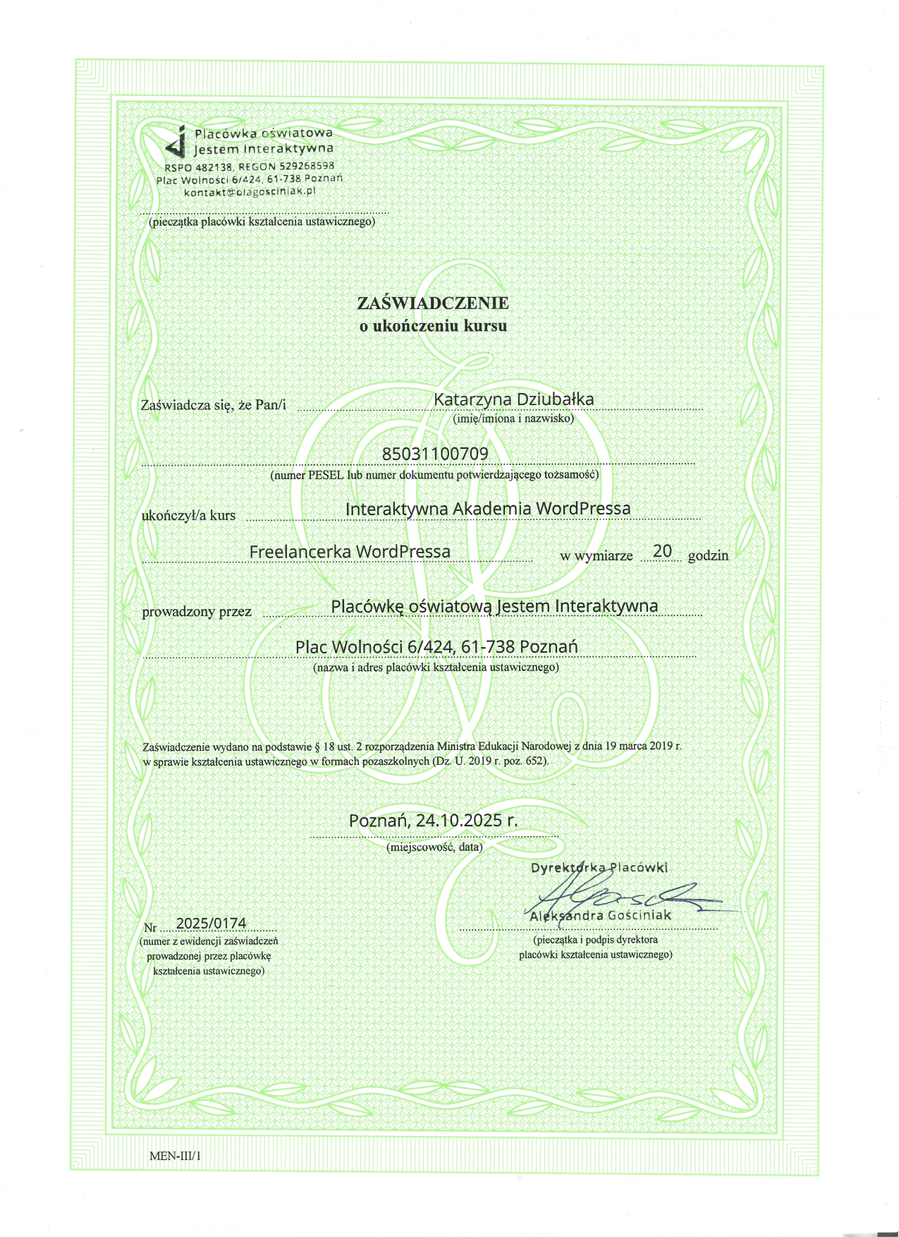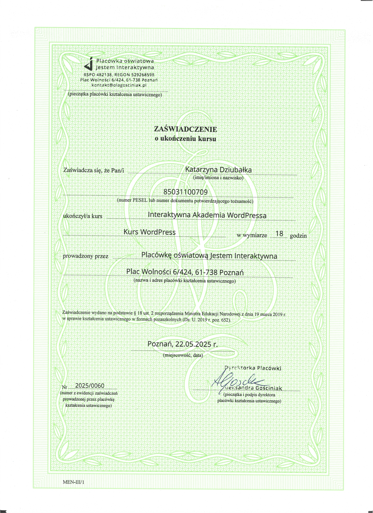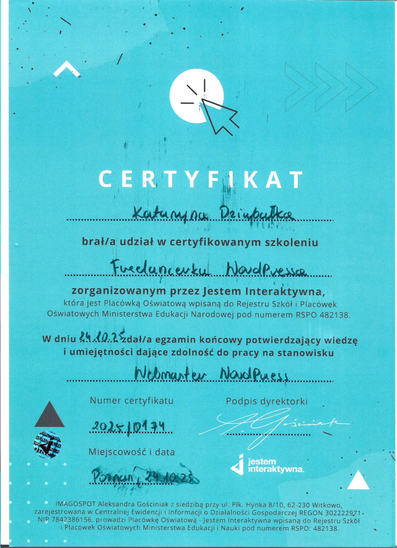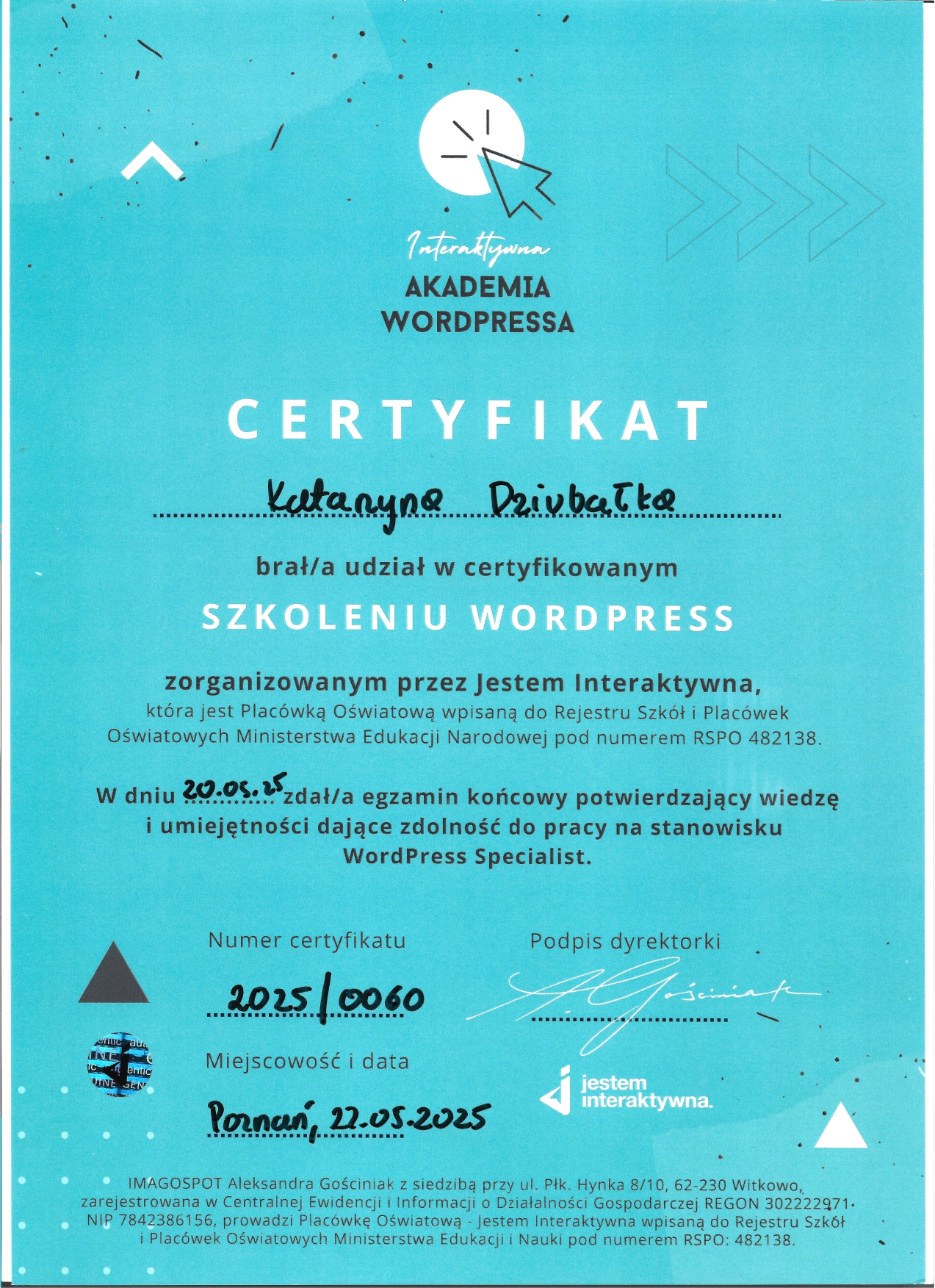 Dlatego poszłam krok dalej. Ukończyłam Interaktywną Akademię WordPress i WooCommerce (potwierdzoną egzaminem MEN) oraz rozpoczęłam naukę w MailerLite Academy, aby łączyć pasję do technologii z budowaniem autentycznego wizerunku online.